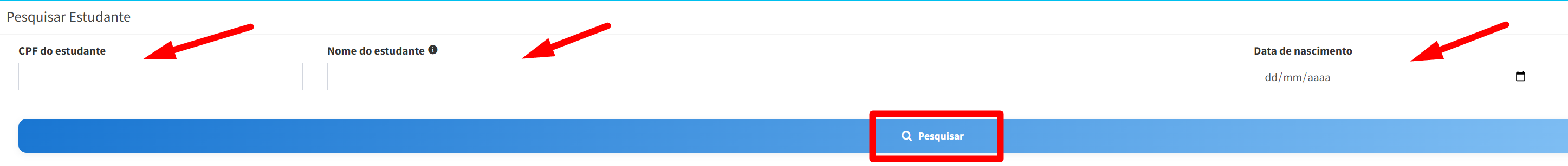 Agora, preencha os campos "CPF do estudante", "Nome do estudante" e "Data de nascimento" e clique em "Pesquisar":