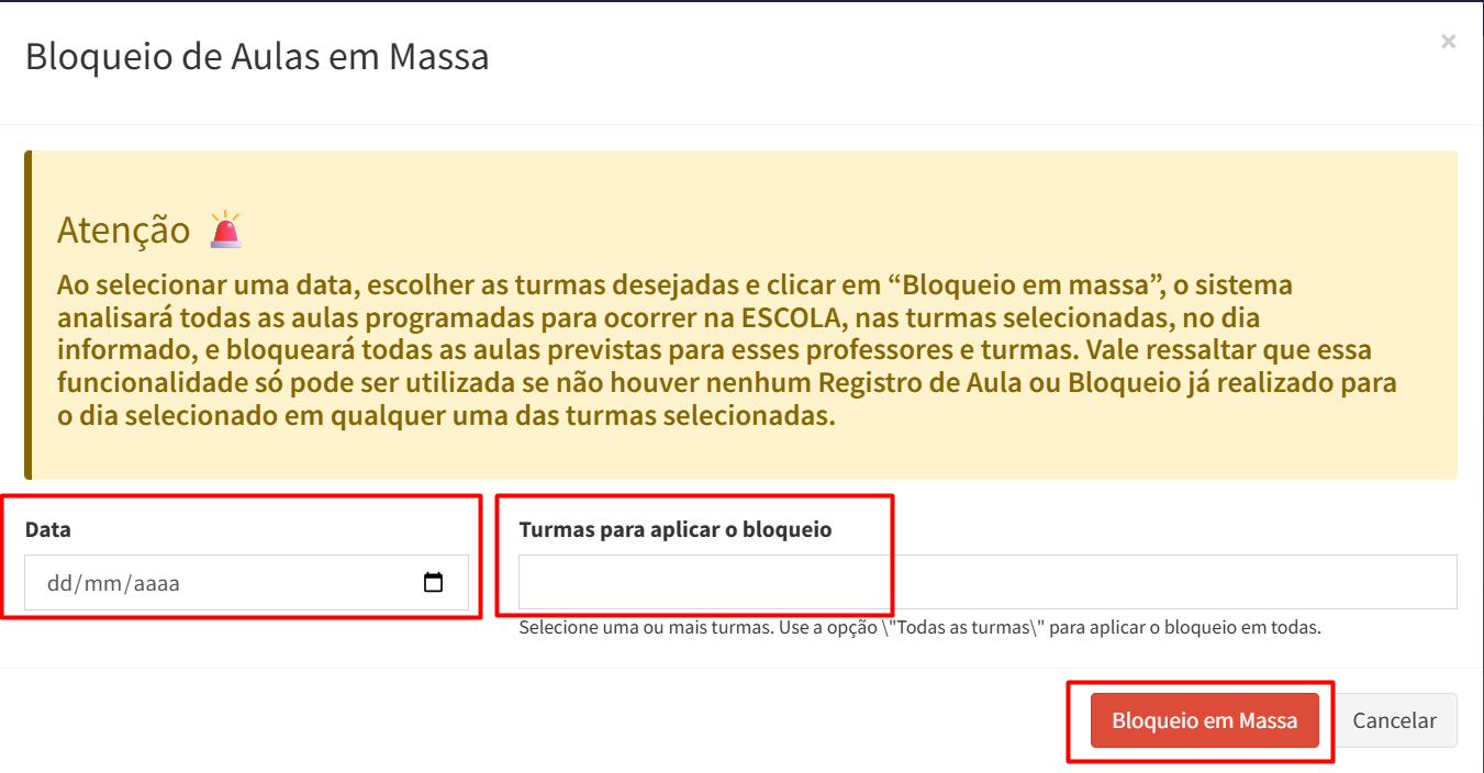 - O bloqueio em massa seleciona todas as aulas previstas para o dia selecionado e em todas as turmas que foram selecionadas; portanto, é importante que as vigências e horários das escolas estejam devidamente arrumados.
