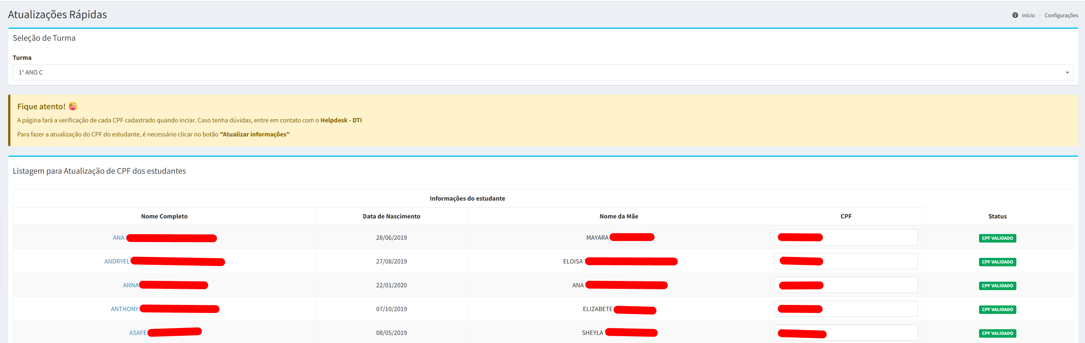 A opção Estudantes (CPF) permite inserir, corrigir e validar o CPF dos estudantes. O sistema realiza verificação automática da validade do CPF cadastrado.