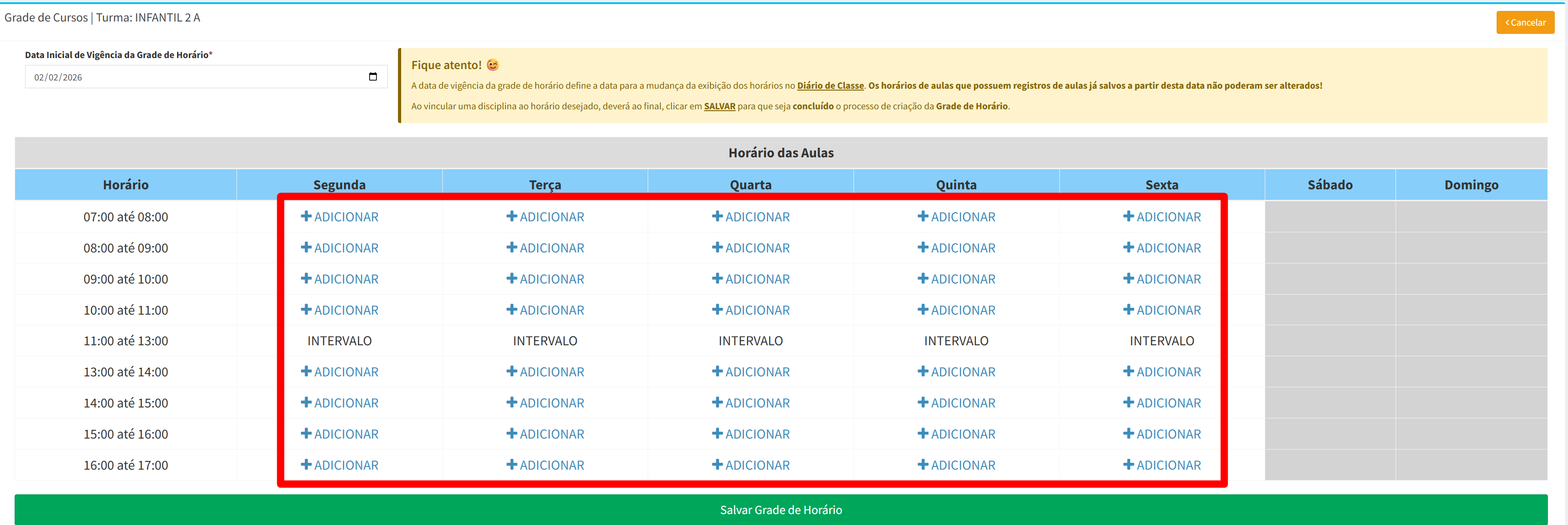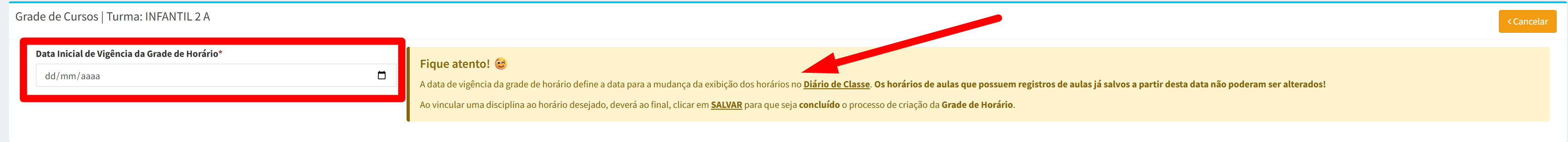Observação: Para entender por que uma grade de horários precisa de uma data inicial de vigência, precisamos lembrar que, da mesma forma que um docente, um gestor ou até mesmo o próprio ano letivo tem o seu "prazo de validade de vigência", contendo direta ou indiretamente sua data de início e fim, a grade de horários não será diferente, deste modo, a cada nova alteração realizada na grade, após a criação da mesma, deverá ser determinada uma nova data inicial de vigência para cada nova grade criada/editada.