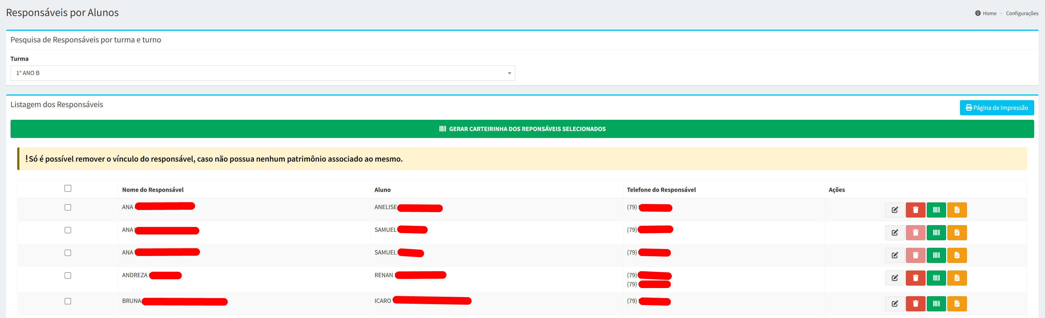 A opção Responsáveis permite consultar e gerenciar os responsáveis vinculados às turmas.