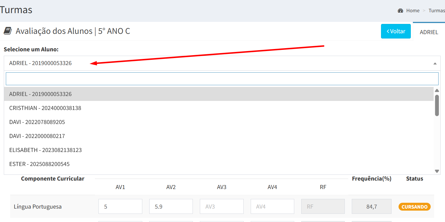 Selecione o estudante desejado e insira suas notas conforme cada componente curricular.