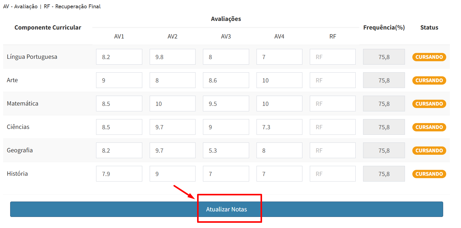 Após preencher todas as notas do aluno desejado, clique no botão “Atualizar notas”.