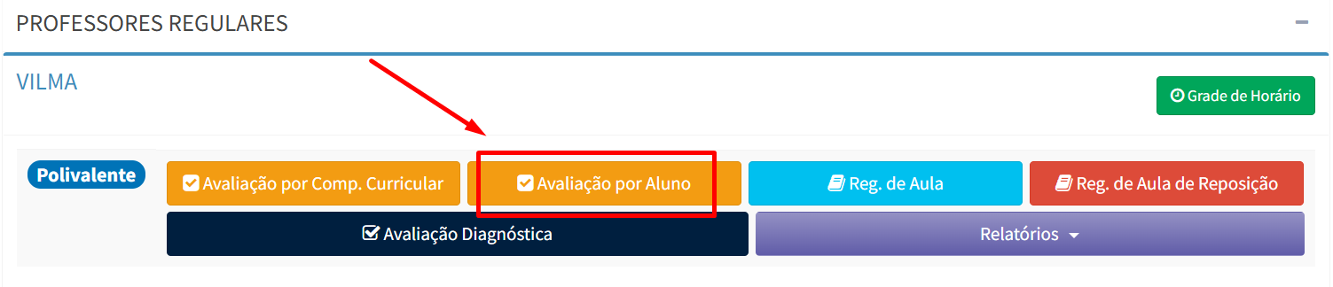 Professores de turmas POLIVALENTES (Fundamental Anos Iniciais e PROEJA I) têm uma opção adicional e mais eficiente para o registro de notas: a funcionalidade "Avaliação por Aluno". Ao invés de selecionar um componente curricular e gerenciar as notas de todos os estudantes de uma só vez, o professor polivalente pode inverter o processo, da seguinte forma: