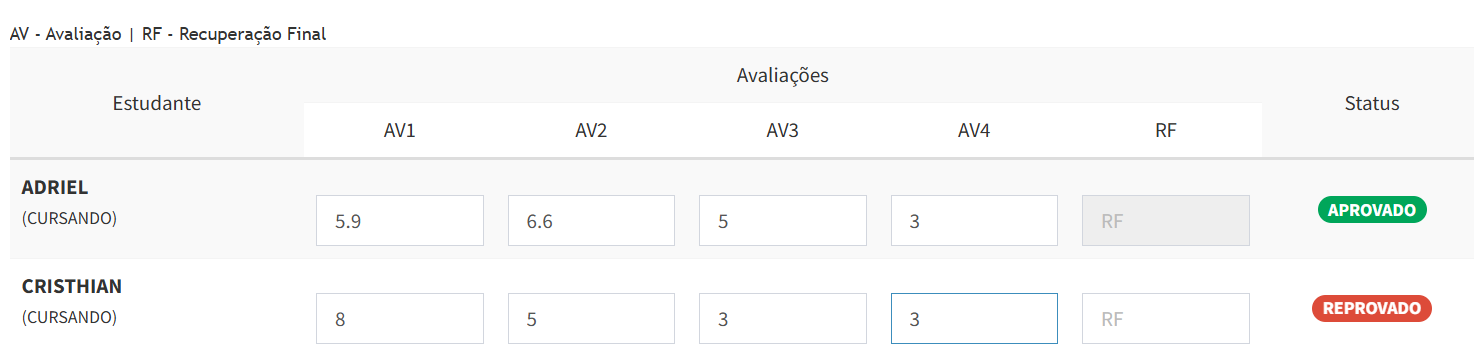 - O campo "Recuperação Final" (RF) é liberado para preenchimento somente se a média geral do estudante estiver abaixo de 5,0 pontos após o lançamento das quatro avaliações regulares;