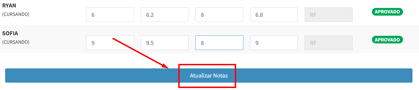 Após preencher todas as notas dos alunos, role a tela para baixo e clique no botão “Atualizar nota”.