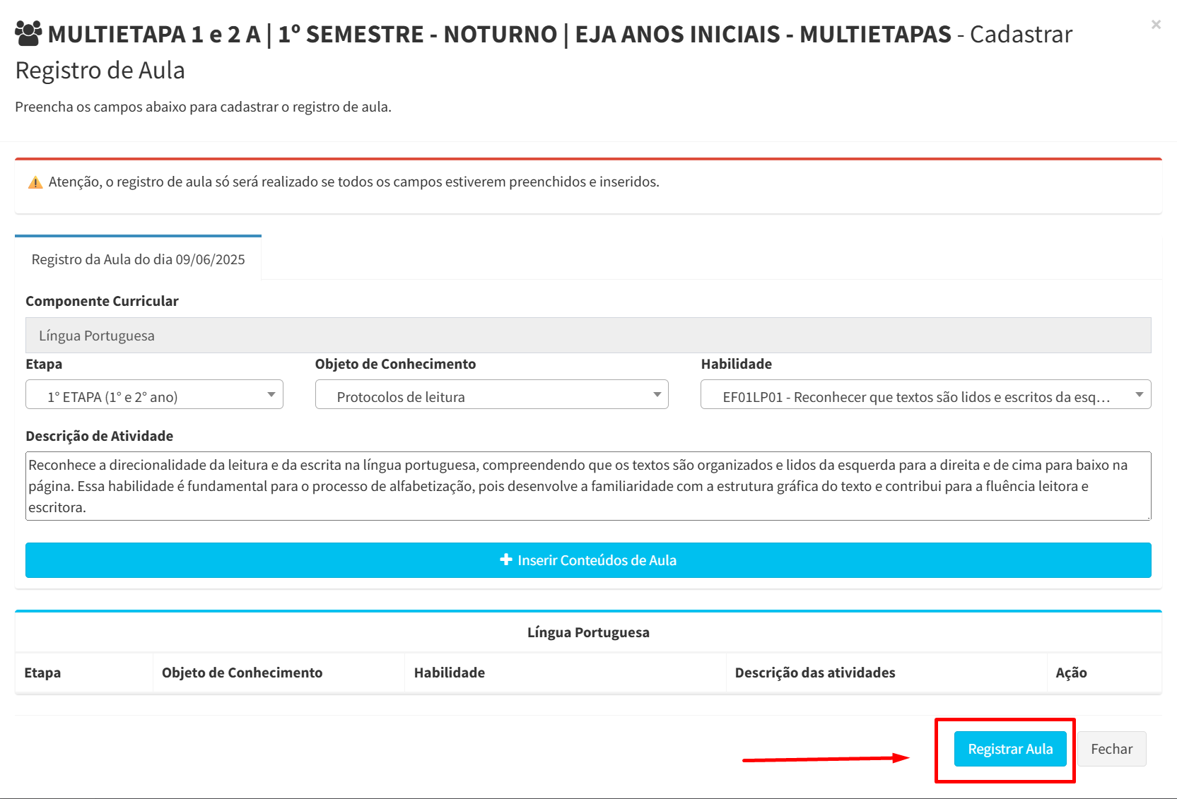 4.2 Após o preenchimento dos campos, aperte em Registrar Aula